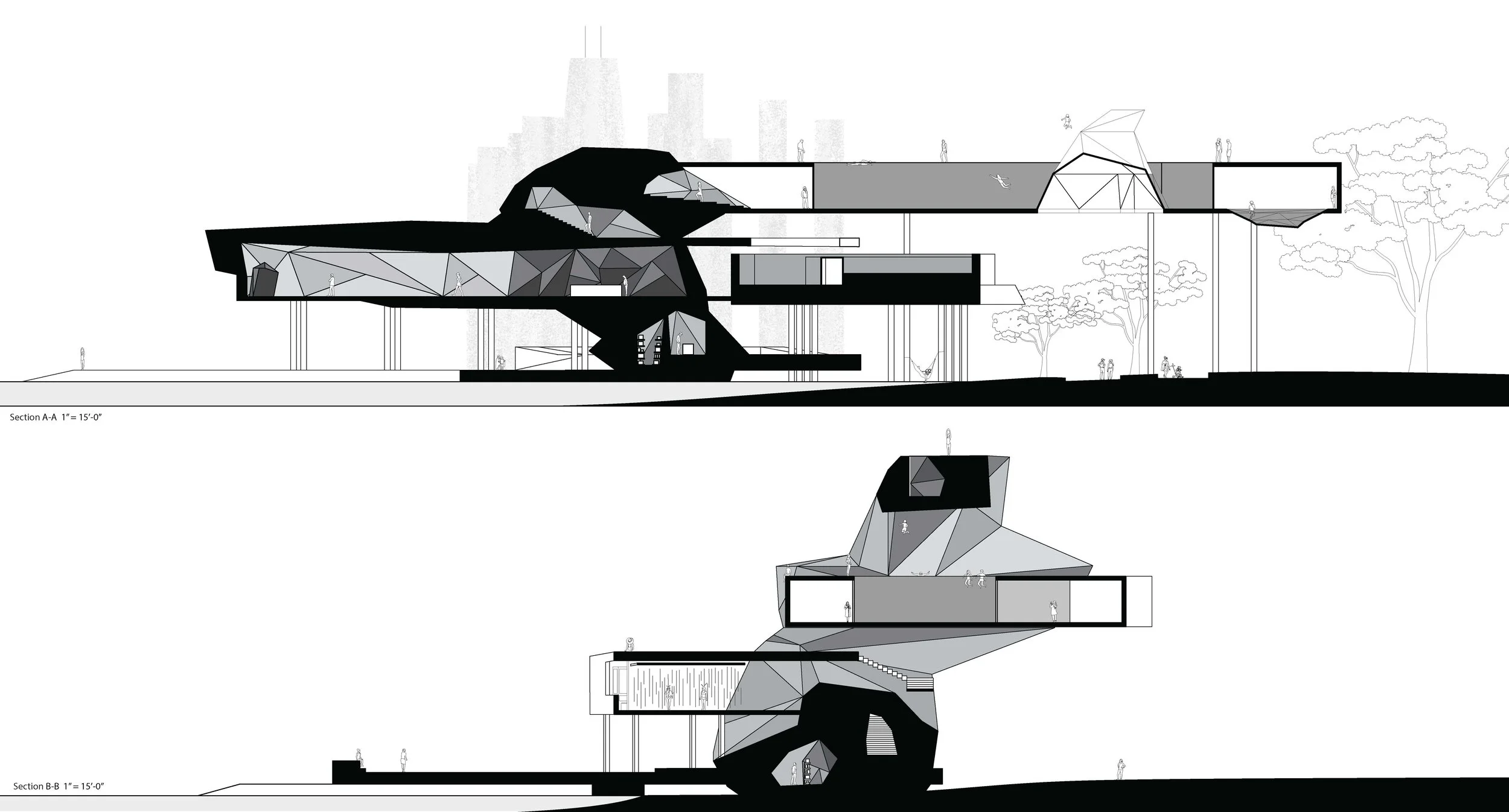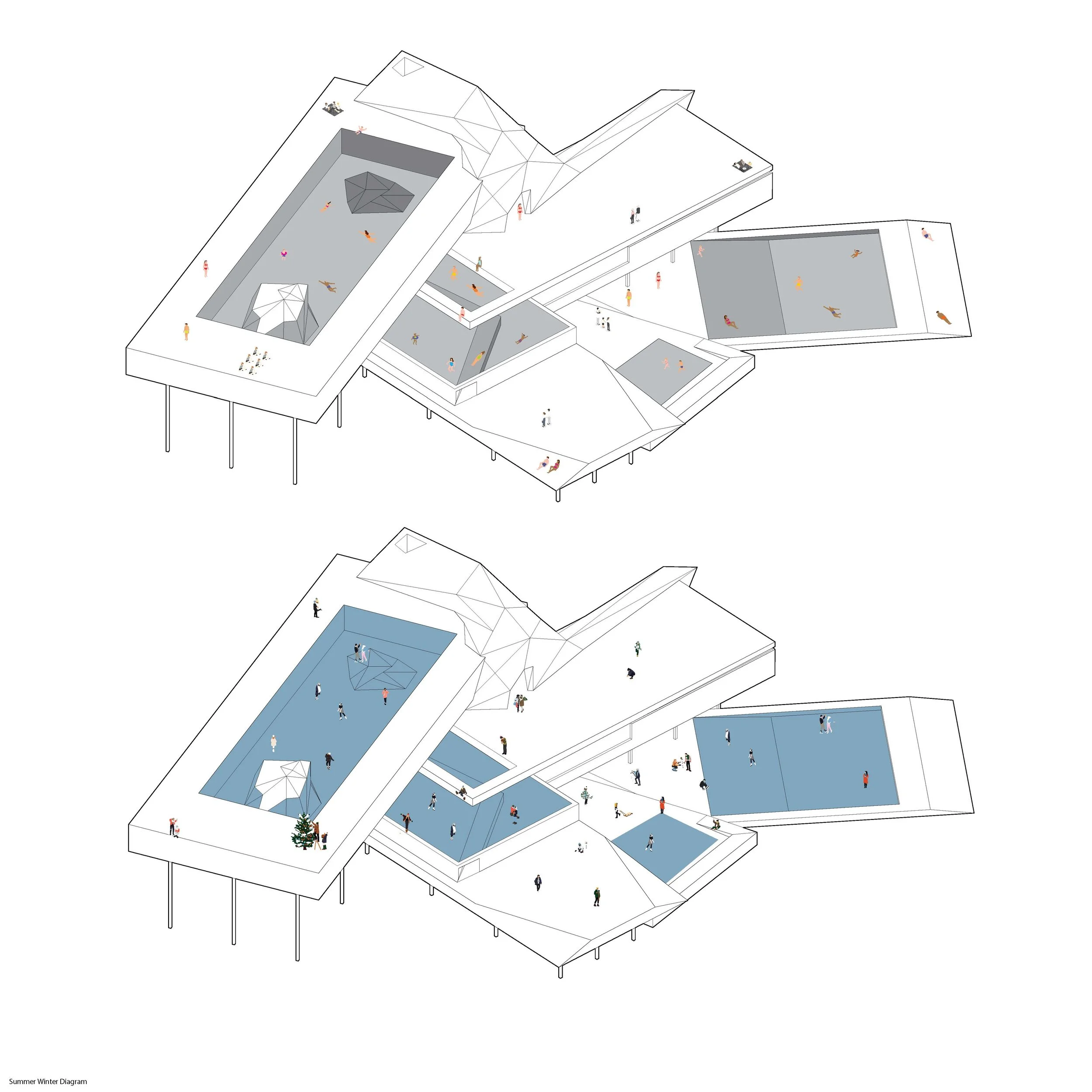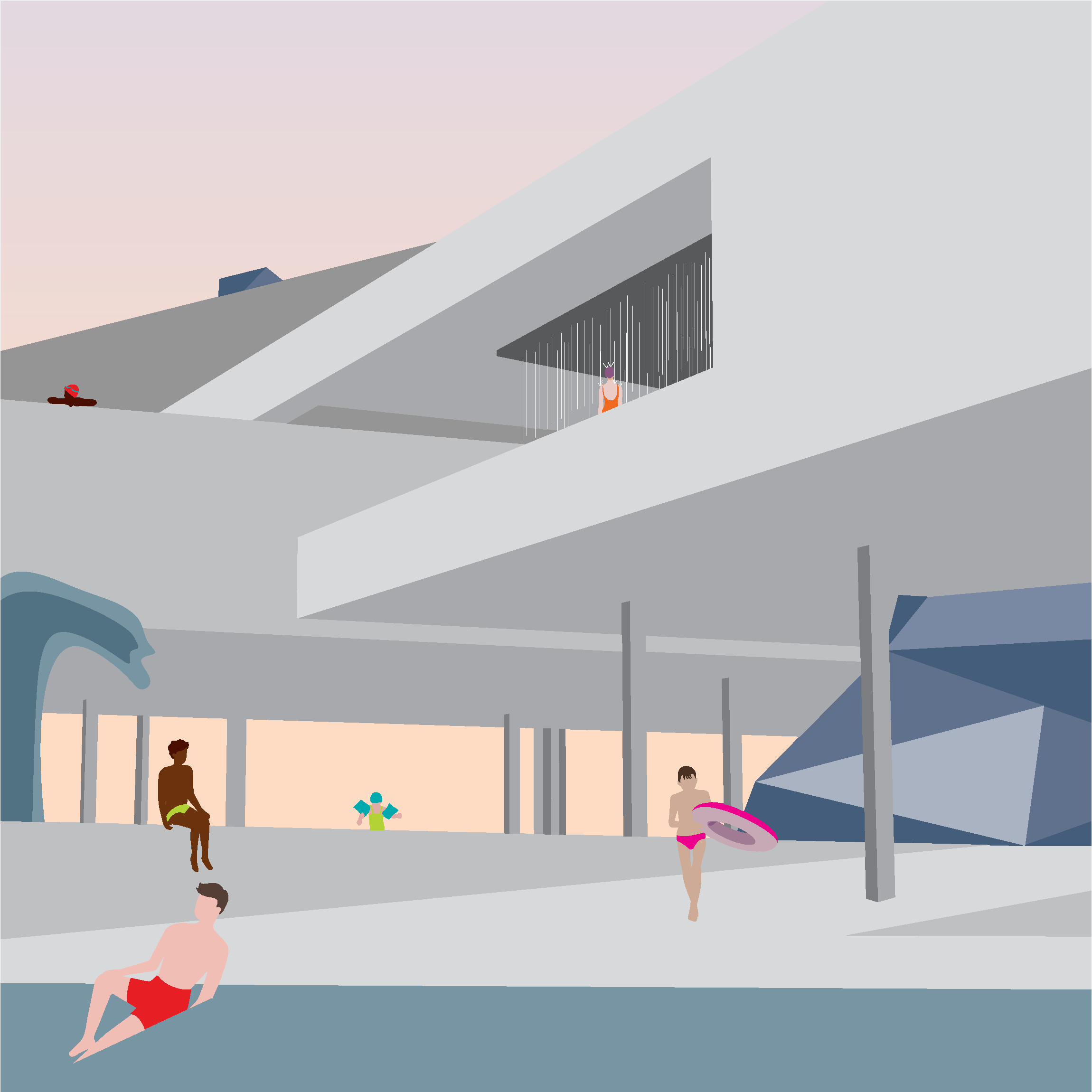The studio was challenged with understanding and studying pools focusing on how individuals interact with them. We were encouraged to increase accessibility to clean water as well as provide accessibility to Lake Michigan. This project reimagines communal spaces, offering an exciting perspective in recreational architecture. With overlapping distinct platforms, boundaries between spaces and perspectives become blurred. Each platform features a unique pool that caters to diverse user experiences. Encouraging continual visual connections, the layout prompts engagement and interaction throughout the structure. Serving as a meeting point between the beach, cement steps, and bike paths, this project facilitates a vibrant social environment. Inviting diverse interactions and experiences within a purposeful and compact design.