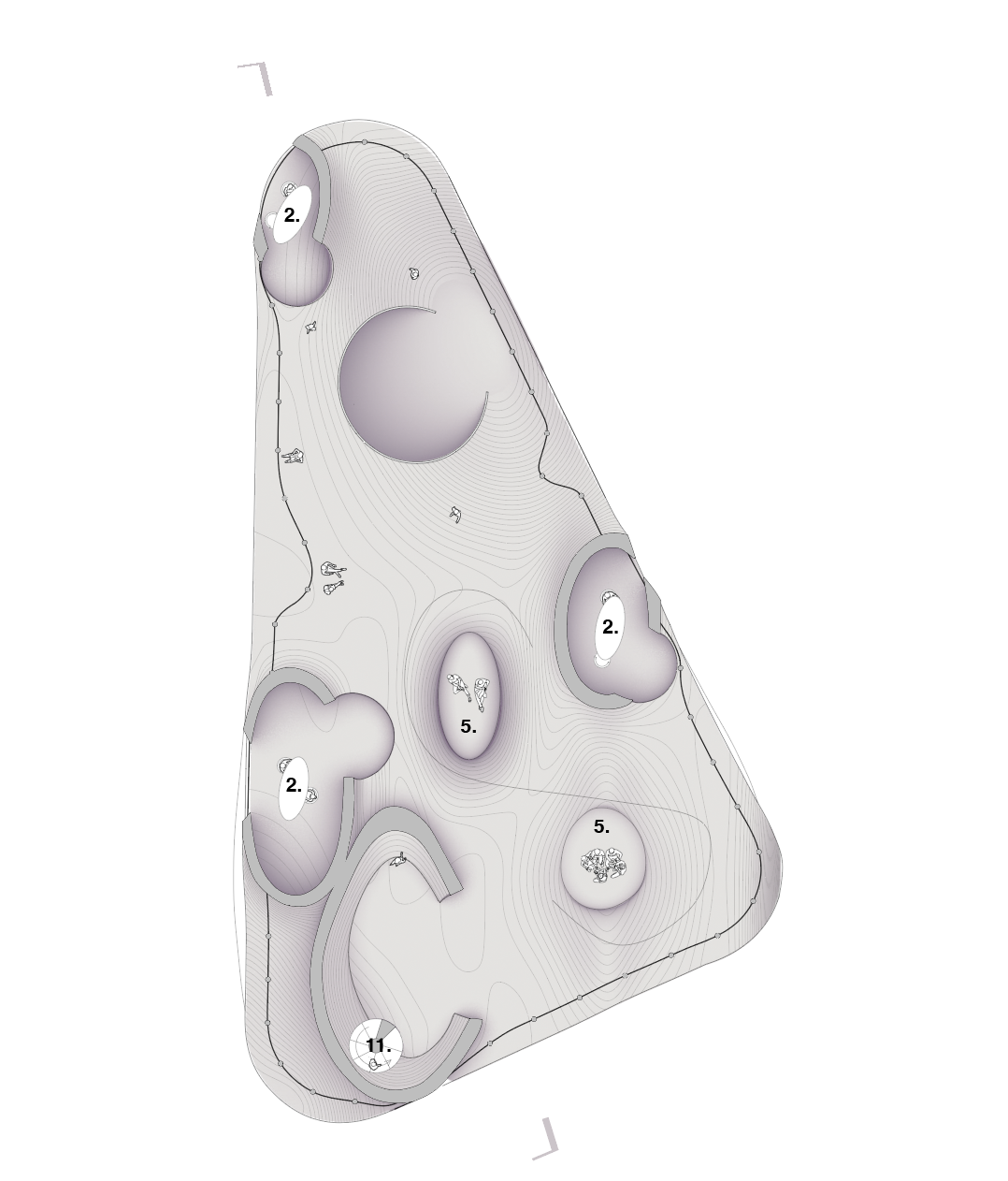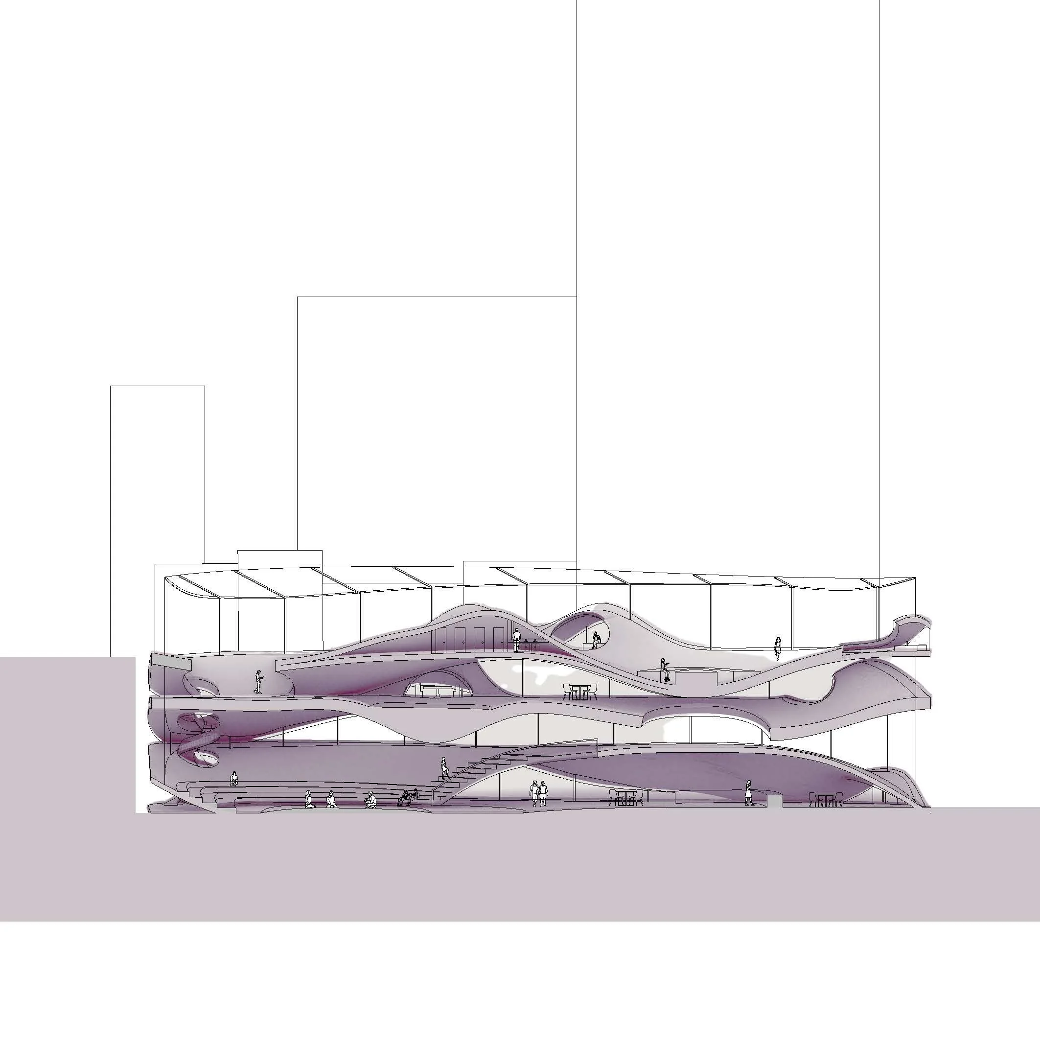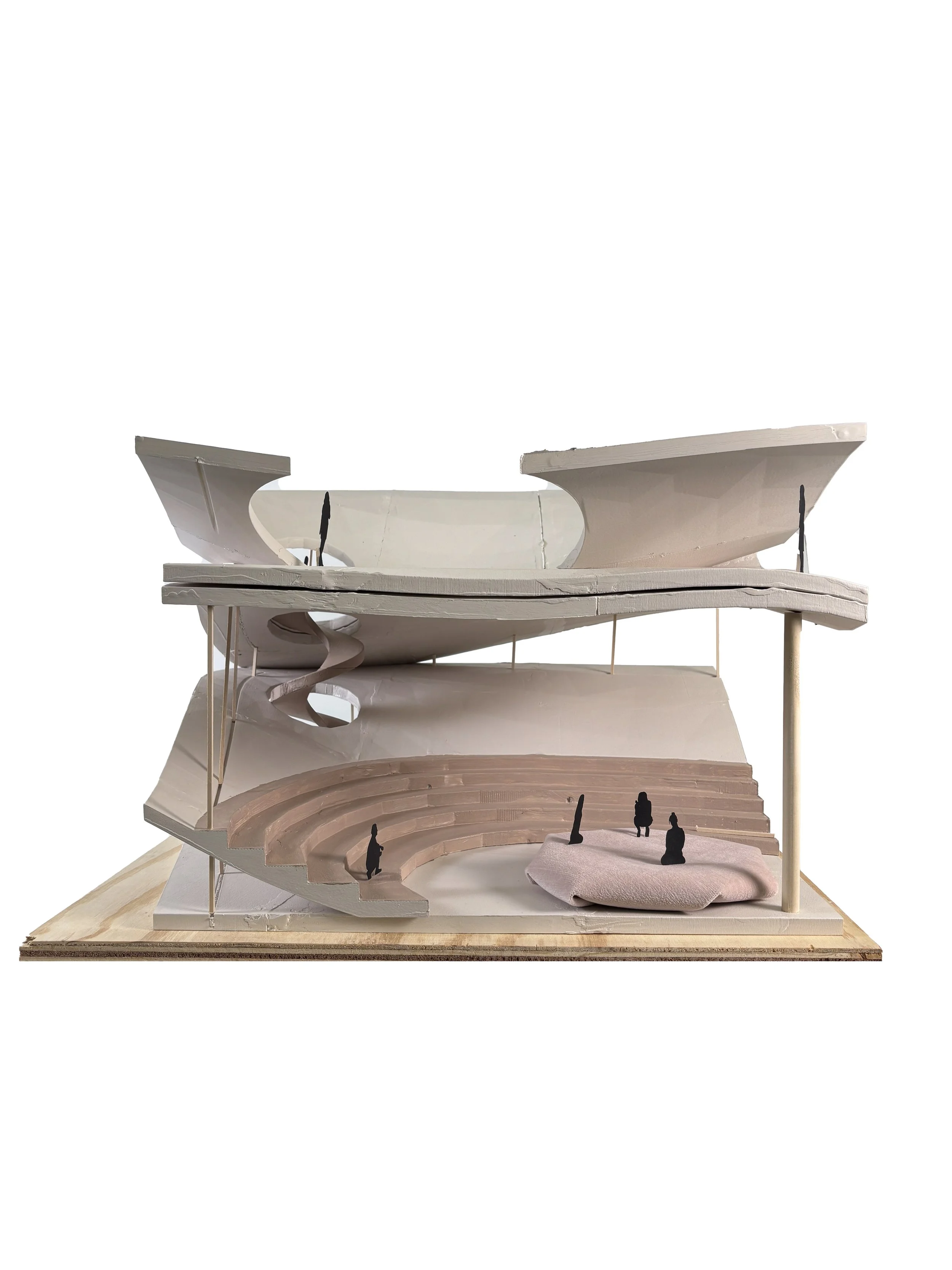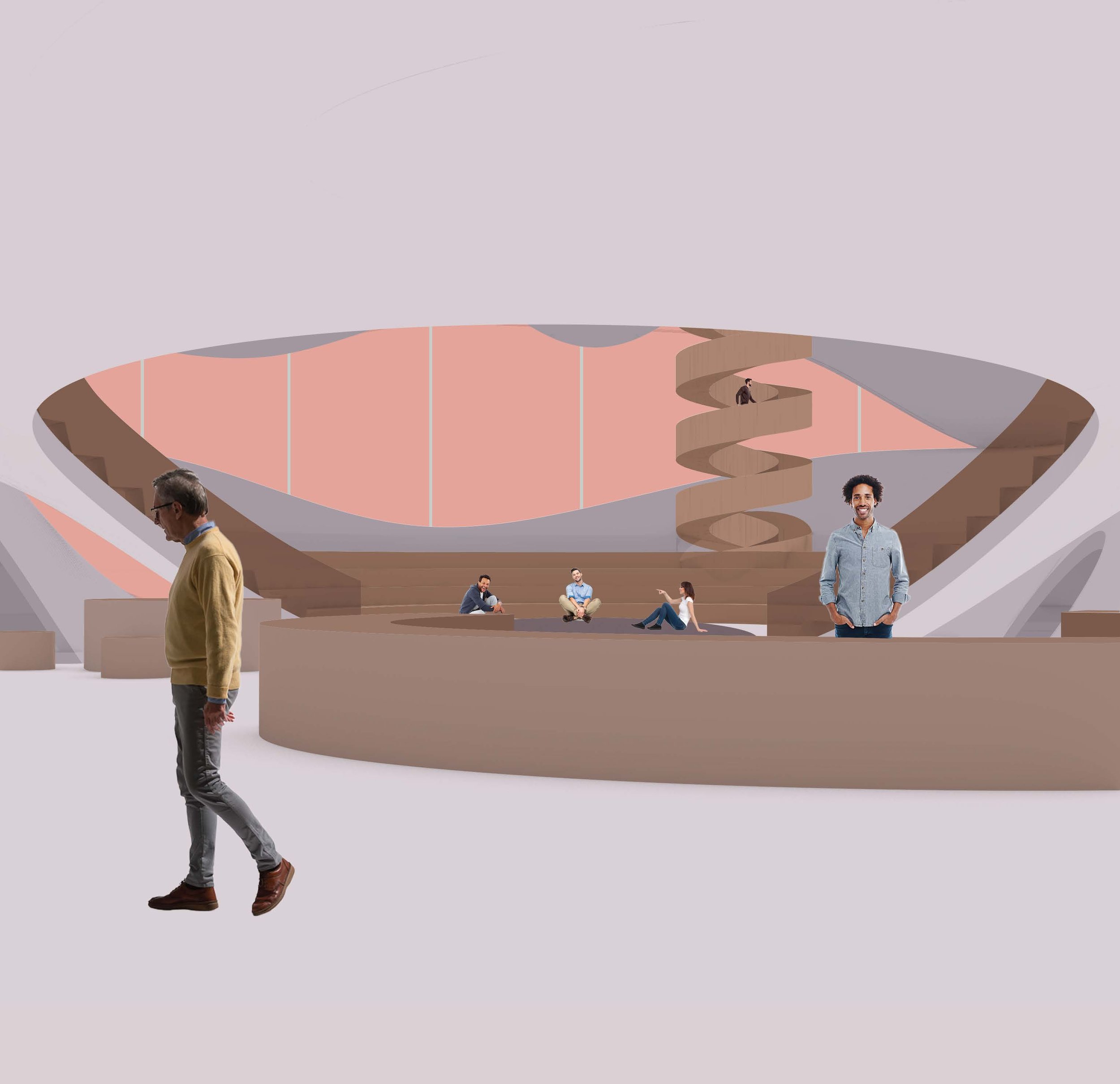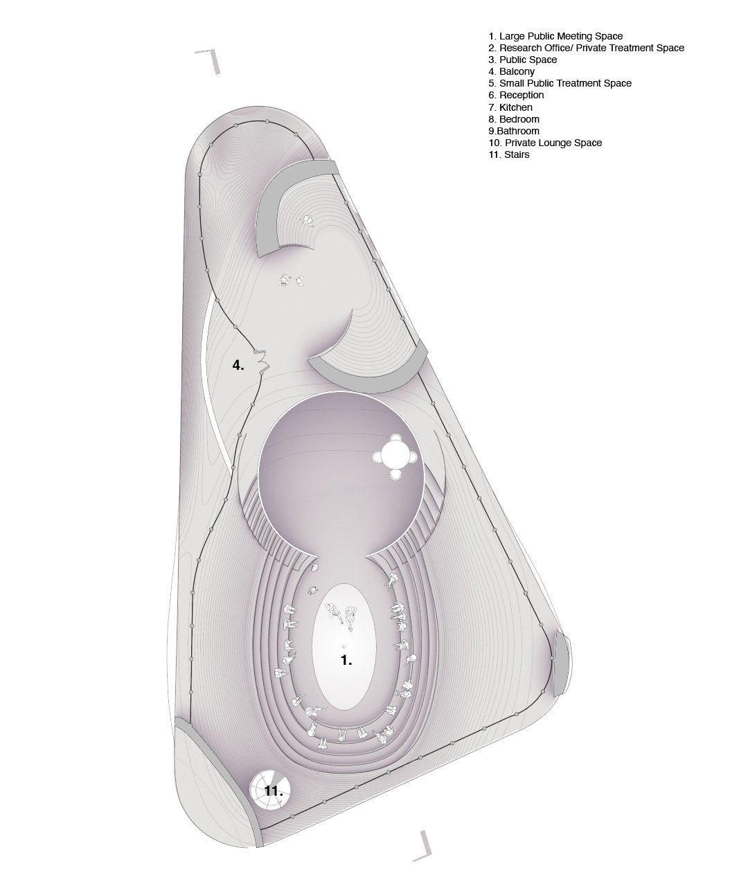 This project aims to support recovery processes focused on community and group therapy while providing privacy for vulnerability. Sloping and flowing floor plates offer varying levels of privacy throughout the structure. When the floor plates slope down, the space cradles individuals, offering them privacy and the opportunity to be vulnerable. When the floor plates slope up, they create private research and treatment areas that protect individuals.